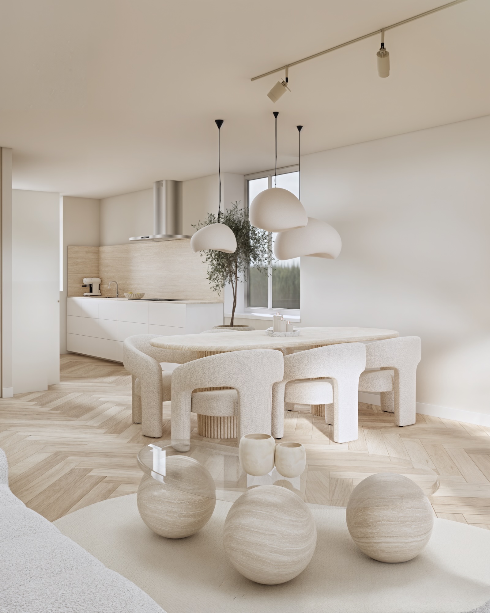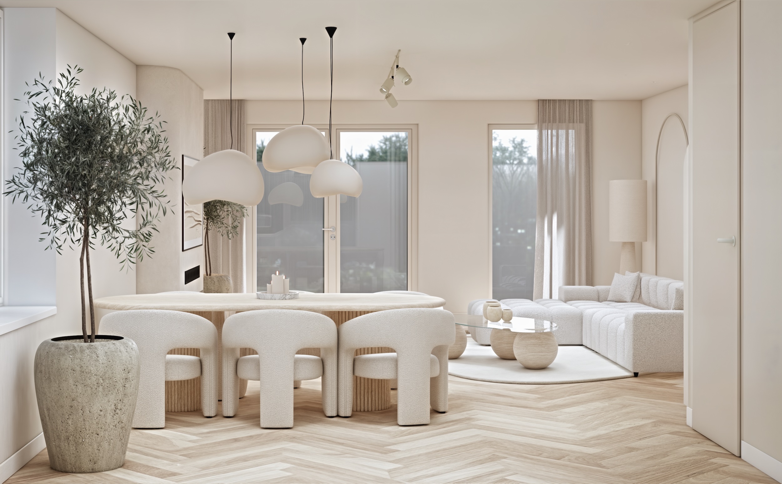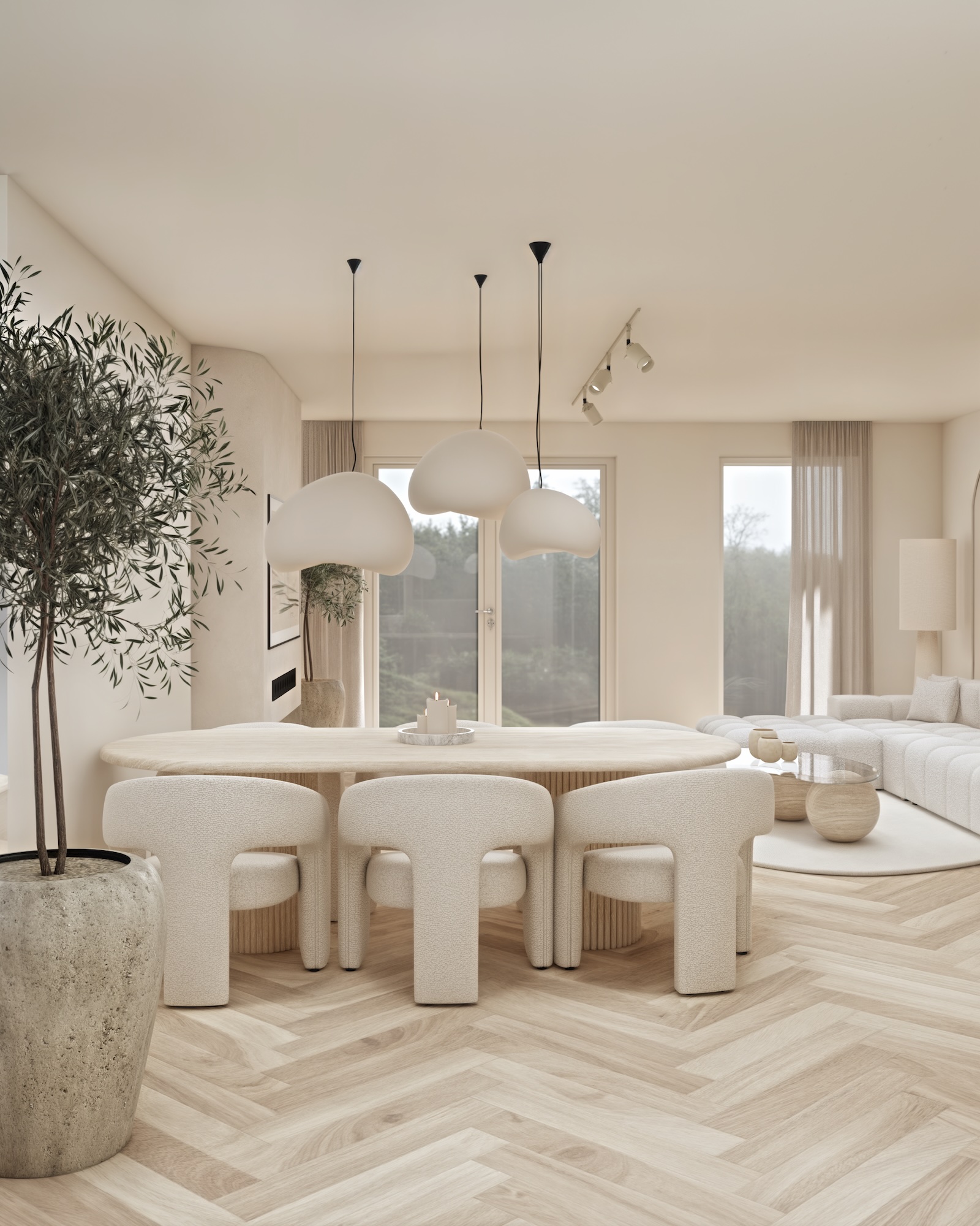 Voor dit ontwerp mochten wij zowel de zolderkamer als de woon- en eetkamer inrichten. De wens van de klant was duidelijk: een licht en sereen interieur dat rust uitstraalt en tegelijkertijd warmte en geborgenheid biedt. We hebben gekozen voor natuurlijke materialen zoals travertin en zachte kleuren, waarmee een harmonieus geheel is ontstaan. Deze stijl hebben we consequent doorgetrokken naar de zolderkamer, zodat het hele huis één rustige, samenhangende sfeer ademt.