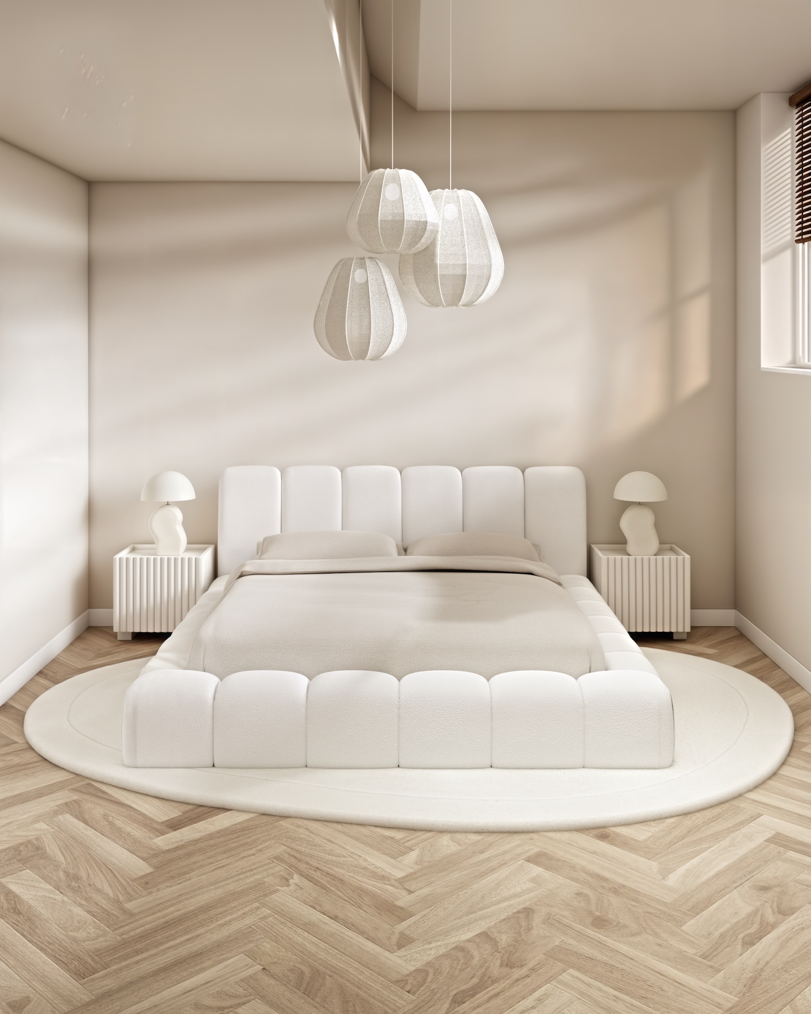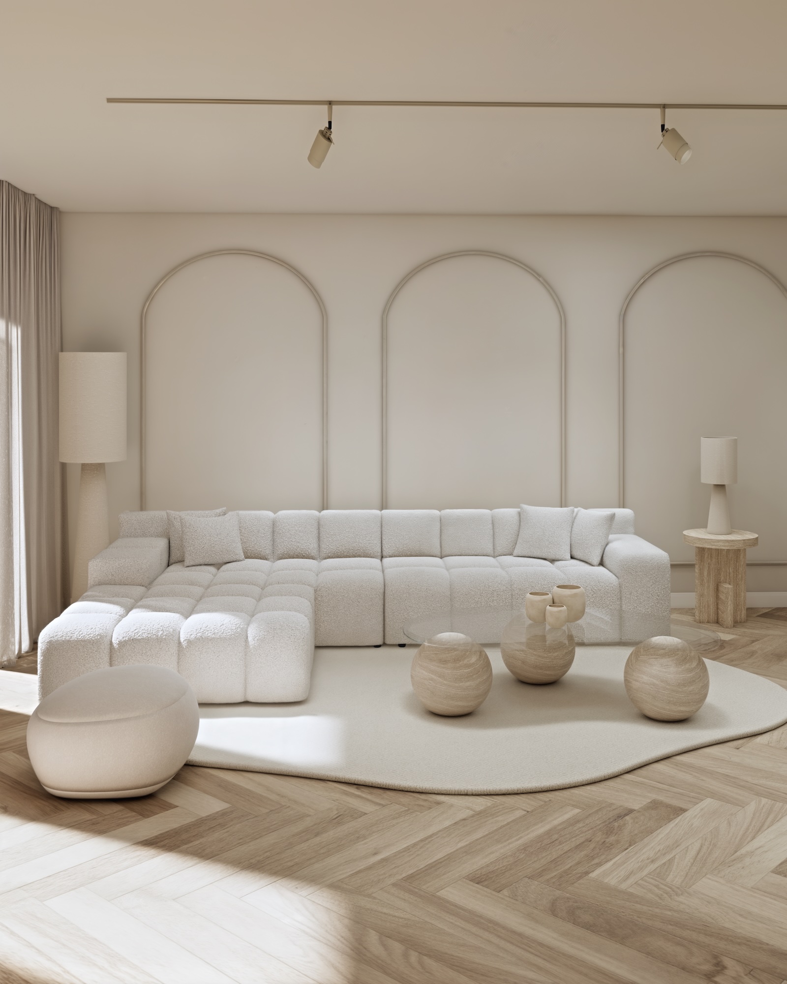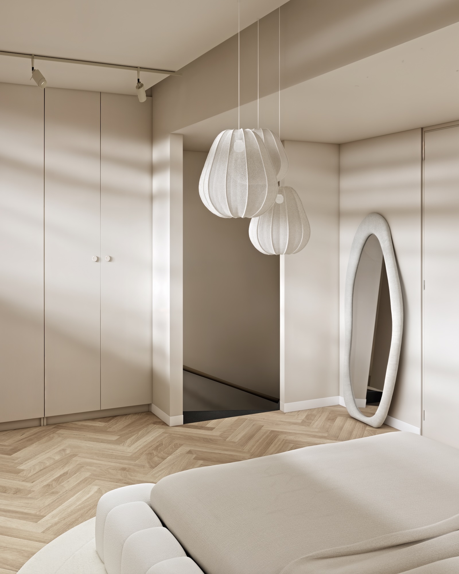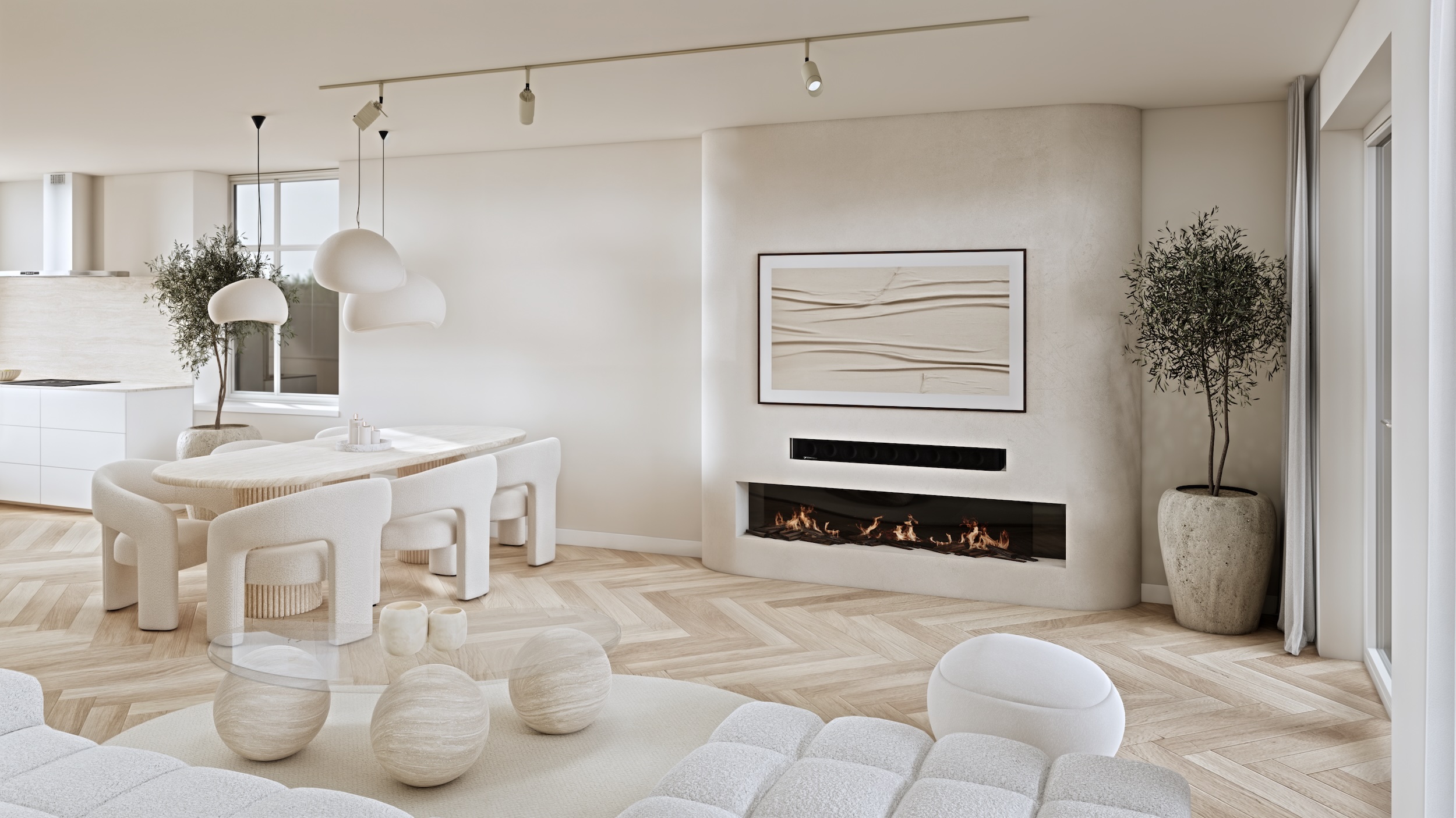 Voor dit ontwerp mochten wij zowel de zolderkamer als de woon- en eetkamer inrichten. De wens van de klant was duidelijk: een licht en sereen interieur dat rust uitstraalt en tegelijkertijd warmte en geborgenheid biedt. We hebben gekozen voor natuurlijke materialen zoals travertin en zachte kleuren, waarmee een harmonieus geheel is ontstaan. Deze stijl hebben we consequent doorgetrokken naar de zolderkamer, zodat het hele huis één rustige, samenhangende sfeer ademt.
